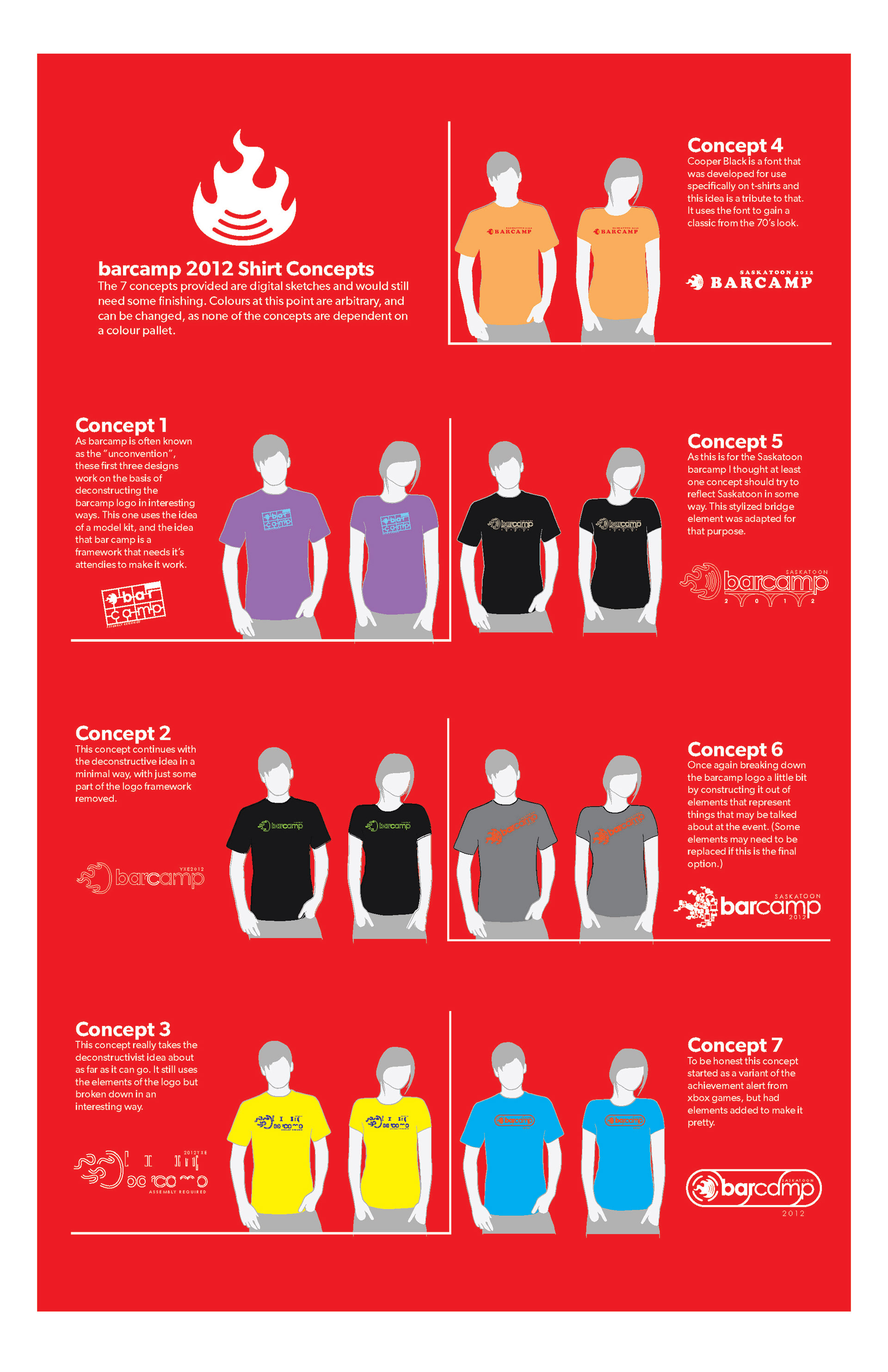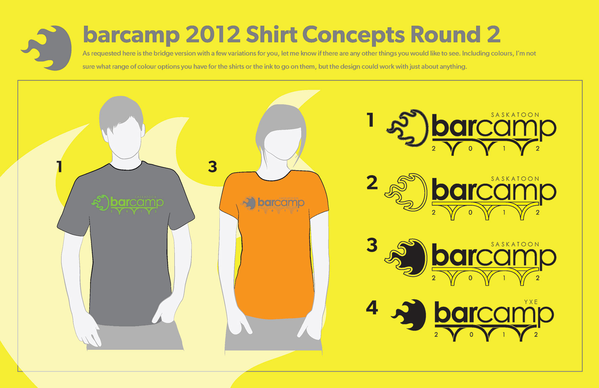 Concepts for Saskatoon Barcamp T-Shirts. Final Design was option 1 from round 2.
